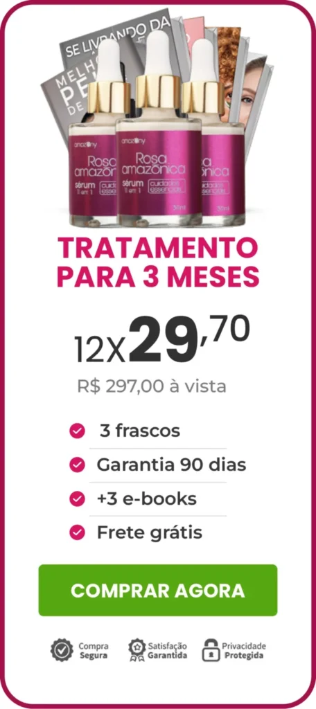 Confiamos tanto na eficácia do Rosa Amazônica que caso você utilize ele durante 90 dias e não tenha resultados, devolvemos o seu dinheiro. Isso mesmo! Resultados em 90 Dias ou seu dinheiro de volta.